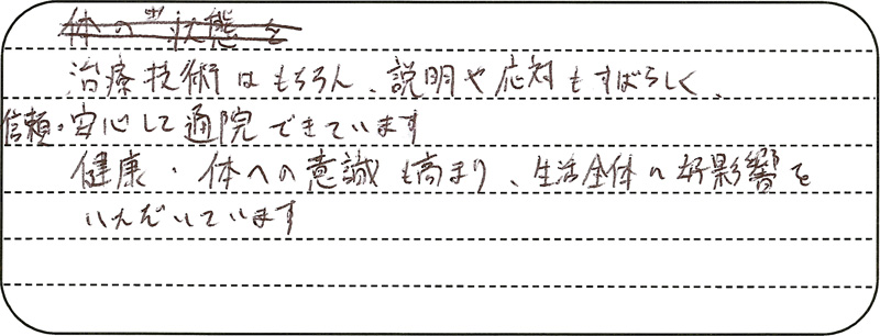 治療技術はもちろん、説明や対応もすばらしく、信頼・安心して通院できています。治療には理論的裏付けが有ると感じられた。