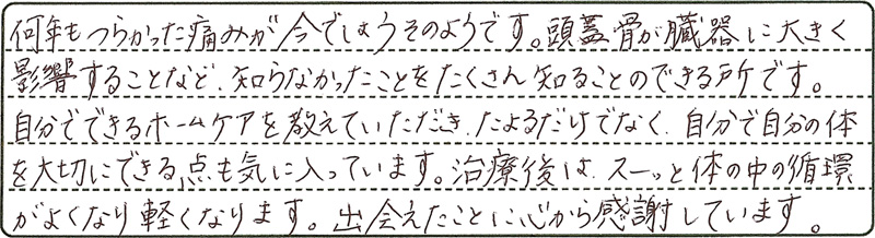 何年もつらかった痛みが今ではうそのようです。出会えた事に心から感謝しています。
